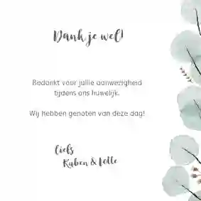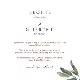 Vaak wordt het lookbook voor de bruiloft ook doorgetrokken naar een duurzame trouwkaart. Hierbij is het goed om te weten dat alle kaarten bij kaartje2go CO-2 neutraal gedrukt worden. Dit maakt onze groene trouwkaarten een duurzamere optie. Ook kun je kiezen voor enveloppen van 100% gerecycled papier en CO-2 neutrale bezorging.