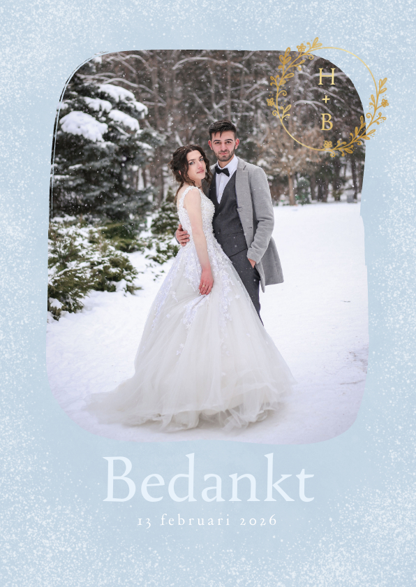 Een klassiek bedankkaartje in winterse kleuren met grote foto. Op de kaart staat een subtiel bloemen ornament en jullie initialen in goudfolie.
