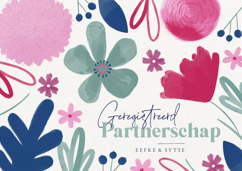 Vrolijke kaart voor een geregistreerd partnerschap met zomerse bloemen op een subtiele papierlook achtergrond. Binnen plek voor je eigen foto en tekst