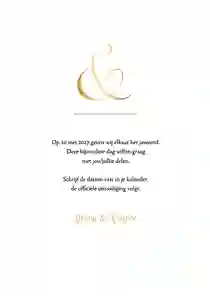 Klassieke Save-the-Date kaart met jullie namen in goudfolie, stijlvol en minimalistisch vormgegeven. Pas het ontwerp helemaal naar wens aan.