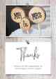 Moderne trouwkaart met een houtlook achtergrond, twee foto's en papiertjes die zijn opgehangen met spijkers. Met aan de binnenkant een tijdlijn!