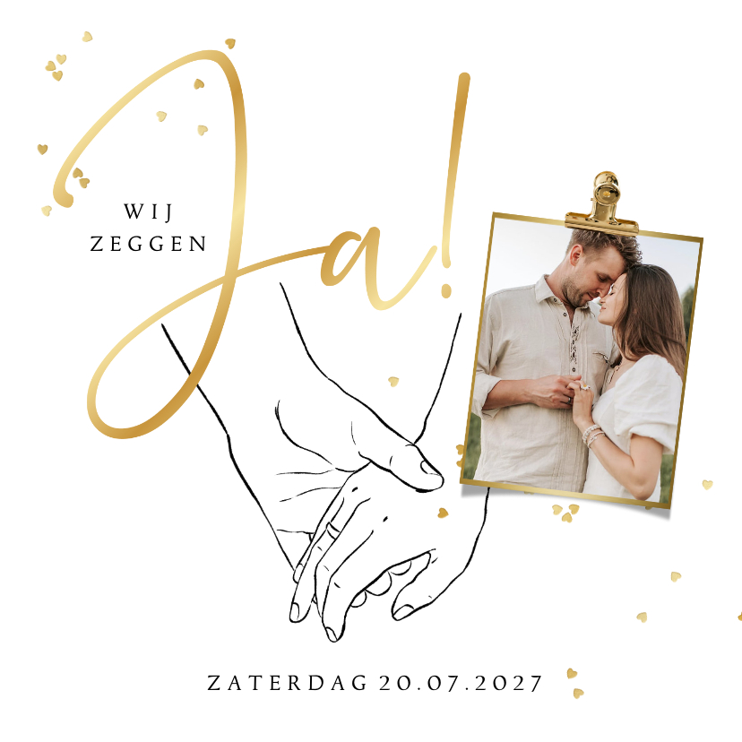 Stijlvolle trouwkaart met lijntekening van handen,'Ja!' in goud en foto op voorzijde gecombineerd met kleine hartjes rondom. Pas teksten naar wens aan