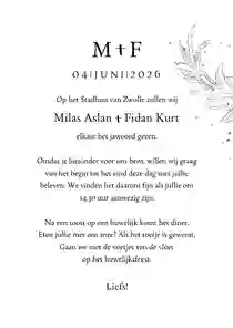 🤍 Bij eenvoudige trouwkaarten valt de boodschap extra op. Denk daarom goed na over de lettertypes die je gebruikt. Zorg ook dat je niet meer dan twee lettertypes gebruikt, bijvoorbeeld één lettertype voor kopjes en één lettertype voor de informatie. Zo houd je je trouwkaart minimalistisch en rustig.