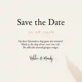 Van klassiek tot stoer en van natuurlijk tot kleurrijk: qua stijl en vormgeving kun je met je save the date kaarten alle kanten op. Op de voorkant van de kaartjes staat vaak in grote letters ‘Save the date’ of de datum van jullie bruiloft. Ook jullie namen mogen natuurlijk niet ontbreken. Save the date kaarten met kalender zijn trouwens enorm populair. Kies een leuke save the date kalender uit en pas de maand en dag aan, zodat jullie trouwdatum prominent op de voorkant staat. Zo zien de genodigden in één oogopslag wanneer jullie grote dag is.