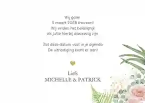 💕 Tip: Sta je op het punt om de save the date voor jullie bruiloft te versturen? Dubbelcheck dan nog even of de trouwdatum echt klopt. Dat is immers het belangrijkste onderdeel van je save the date kaart.