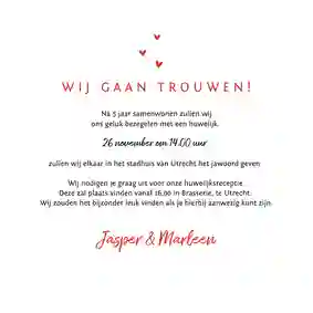 Zeker weten dat niemand jullie trouwdatum vergeet? Dat zit je met deze trend goed. We zien steeds meer klanten kiezen voor een trouwkaart waarbij de datum groot op de voorkant staat. Dit kan zowel horizontaal als verticaal. Hoe de kaart er verder uitziet, dat is helemaal aan jou! Kies bijvoorbeeld voor kleuren die passen bij jullie thema of dresscode. Ook leuk: een trouwkaart met een kalender op de voorkant, waarop je jullie trouwdatum kunt omcirkelen.