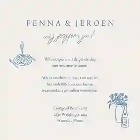 Met de uitnodiging voor je bruiloftsfeest geef je jullie gasten een eerste indruk van hoe de trouwdag zal verlopen. Het thema van de bruiloft kun je laten terugkomen op de kaart. Zo kunnen je genodigden alvast een beetje sfeer proeven. Wij helpen je graag bij het uitkiezen, bestellen en versturen van jullie trouwuitnodigingen.