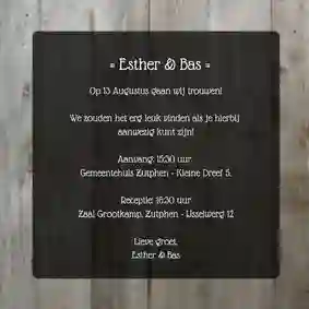 Met de uitnodiging voor je bruiloftsfeest geef je jullie gasten een eerste indruk van hoe de trouwdag zal verlopen. Het thema van de bruiloft kun je laten terugkomen op de kaart. Zo kunnen je genodigden alvast een beetje sfeer proeven. Wij helpen je graag bij het uitkiezen, bestellen en versturen van jullie trouwuitnodigingen.