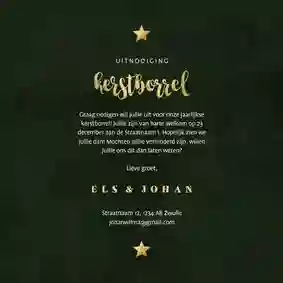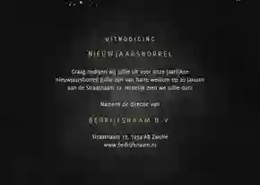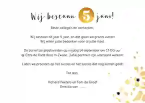 Het 50-jarig bestaan van een bedrijf, een werknemer die 15 jaar in dienst is of de opening van een nieuwe vestiging: er zijn genoeg redenen om een bedrijfsborrel te organiseren. Bij Kaartje2go kun je de leukste uitnodigingen voor een borrel met collega’s vinden. Ga je all out met een groot bedrijfsfeest, dan is een borrel uitnodiging met goudlook een echte aanrader. En organiseer je juist een kleinschalige werkborrel of vrijmibo? Dan is een borrel uitnodiging met een persoonlijke touch extra leuk. Een uitnodiging voor een pensioen borrel kun je bijvoorbeeld persoonlijk maken met foto’s en een eigen tekst. Zo wordt het een beregezellige borrel.