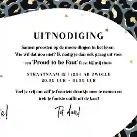 Binnen het thema foute party heb je ook nog extra thema’s, zoals een disco of glitter en glamour party. Wat je ook kiest, de uitnodiging is makkelijk te matchen met het thema en nog fouter te maken in onze kaartmaker. Voeg hier foute figuren toe, zoals een panter, discobal of extra glitter. Er is ook nog ruimte voor jouw eigen foute foto. Zo maak je de uitnodiging nog leuker.