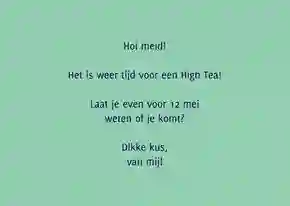 Wat je op de high tea uitnodigingskaart zet, is helemaal aan jou. Toch geven we je graag wat handige tips voor informatie die eigenlijk niet mag ontbreken. Zet op de kaart: