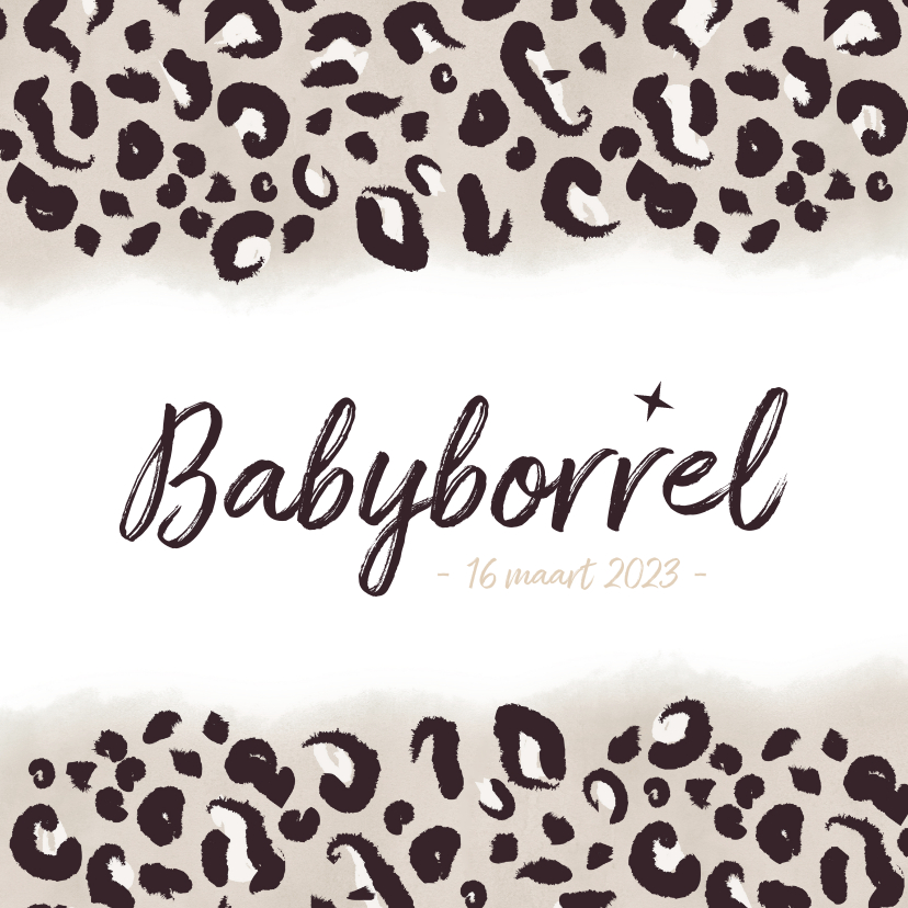 Hippe babyborrel uitnodiging met taupe panterprint en datum