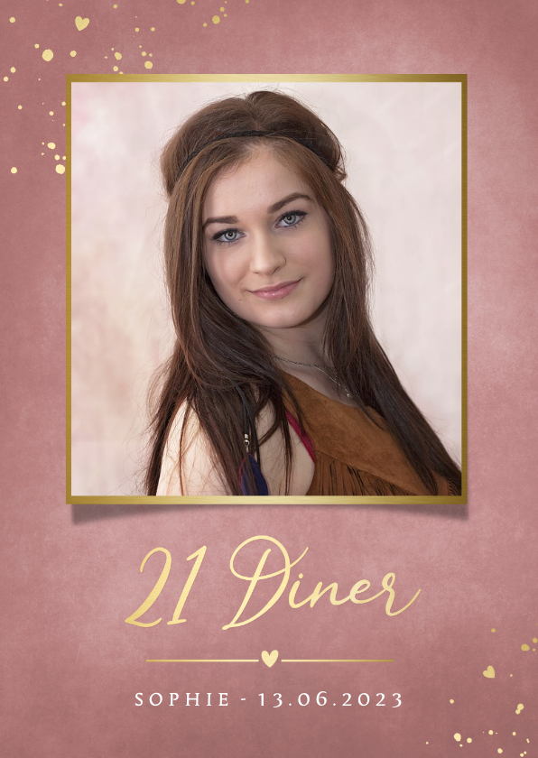 Mooie stijlvolle uitnodigingskaart voor jouw 21 diner. Met een oud roze achtergrond, goudlook spetters en een eigen foto.