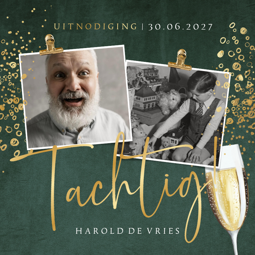 Stijlvolle uitnodiging tachtig jaar op velvet groen, elementen in goudlook, bubbels en illustratie van champagneglas. Twee foto's op voorzijde.