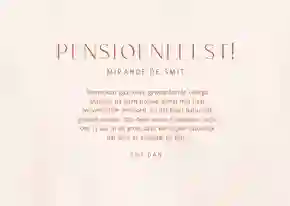 Het pensioen is altijd reden voor een feestje. Je sluit een lange periode in je leven af en stopt vanaf nu met werken. Een goede reden dus om de bloemetjes even buiten te zetten. En het is ontzettend leuk om dit samen met familie, vrienden en collega’s te vieren. Nodig ze daarom uit met een feestelijke pensioen uitnodiging. Zo laat je weten dat je met pensioen gaat en deze mijlpaal wilt vieren met een receptie, borrel of afscheidsfeestje. Onze collectie is gevuld met pensioen uitnodigingen in verschillende stijlen en thema’s. Scroll door de galerij en gebruik ons handige filtermenu om de perfecte uitnodiging te vinden.