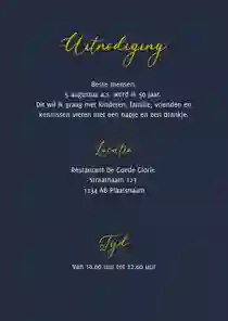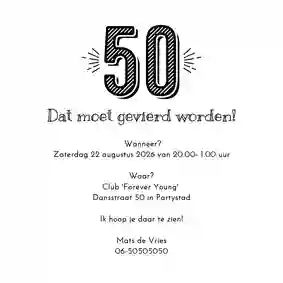 Is de datum geprikt en de feestlocatie gekozen? Dan is de volgende stap de verjaardagsuitnodiging bestellen.We hebben een hele verzameling 50 jaar uitnodigingen voor mannen gemaakt. Speciaal voor de kersverse Abrahams. Bekijk in alle rust de kaarten in de collectie en gebruik de filters om een originele 50 jaar uitnodiging voor een man te vinden. Wacht dacht je bijvoorbeeld van een grappige uitnodiging voor Abraham of een klassieke, stijlvolle of moderne kaart? Of iets met confetti en slingers. Ook leuk: een kaart met een 50 verkeersbord, het geboortejaar of een meter bier.