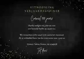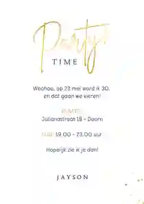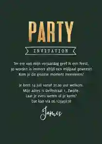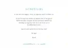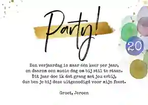 Hoewel de kaarten voor mannen soms flink van elkaar verschillen, hebben de uitnodigingen ook overeenkomsten. Zo maakten onze designers veel gebruik van donkere kleuren als zwart en grijs, net als typische ‘mannen’ kleuren als blauw en groen. Spetters, sterren en confetti in leuke kleuren maken er echt een feestje van. Verder zie je ook aan de details op de uitnodigingen dat ze voor een man gemaakt zijn. Denk bijvoorbeeld aan illustraties van een glas wijn, klinkende bierglazen of een fles sterkedrank.