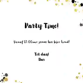 Hoewel de kaarten voor mannen soms flink van elkaar verschillen, hebben de uitnodigingen ook overeenkomsten. Zo maakten onze designers veel gebruik van donkere kleuren als zwart en grijs, net als typische ‘mannen’ kleuren als blauw en groen. Spetters, sterren en confetti in leuke kleuren maken er echt een feestje van. Verder zie je ook aan de details op de uitnodigingen dat ze voor een man gemaakt zijn. Denk bijvoorbeeld aan illustraties van een glas wijn, klinkende bierglazen of een fles sterkedrank.