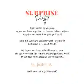 Een uitnodiging maken voor een vrouw die vijftig jaar wordt doe je pas als de plannen voor de verjaardag vastliggen. Na lang wikken en wegen is de locatie bekend en ook is er voor een thema gekozen. Nu nog een leuke uitnodiging met ‘50 jaar’ vinden die daarbij past! Alleen op deze pagina vind je al meer dan honderd ontwerpen voor vrouwen die Sarah worden. Organiseer je het 50 feest niet voor jezelf, maar voor een andere vrouw? Zet dan duidelijk op de kaart dat het om een surprise party/verrassingsfeest gaat en laat ook op de kaart weten dat de Sarah in spe van niets weet!