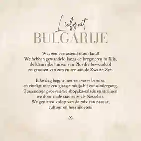 Als je je ‘groeten uit’ ansichtkaart op werkdagen voor 21:00 uur bestelt, dan doen we deze diezelfde dag nog op de post. Zo liggen jouw vakantiegroetjes lekker snel bij de ontvanger op de deurmat. Fijne vakantie nog!