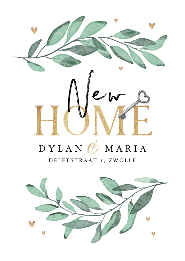 Laat vrienden en familie weten dat jullie zijn verhuisd met dit stijlvolle kaartje met goudlook letters, hartjes en botanische takjes.