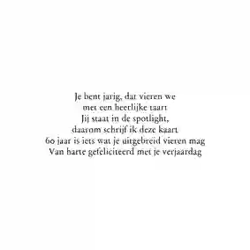 Je hebt een verjaardagskaart uitgekozen voor iemand die de leeftijd van zestig jaar bereikt. Maar hoe feliciteer je eigenlijk iemand, die 60 wordt? In onze blog met verjaardagsteksten vind je originele quotes, spreuken en gedichten. Het leukst zijn misschien wel de teksten die inspelen op de leeftijd die de jarige bereikt. Want zestig … dat is toch wel een beetje een gekke leeftijd. De belangrijke mijlpaal van 50 jaar is reeds gepasseerd en die van 65? Die moet nog komen. Van grijze, minder of geen haren is ongetwijfeld al wel sprake; een grappig gegeven om de (bijna) 60-jarige mee te plagen!