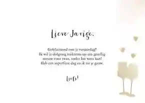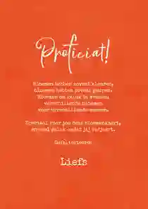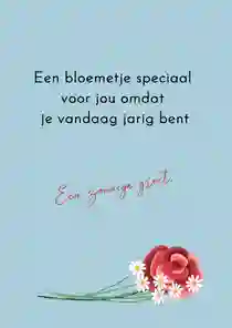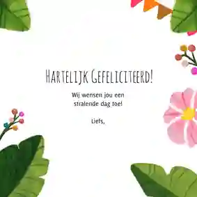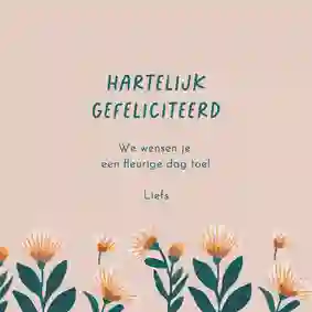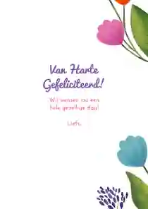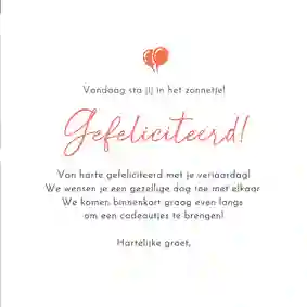 Op de verjaardagskaart voor je moeder kun je een tekst schrijven als ‘Allerliefste mama, gefeliciteerd!’ of ‘Voor mijn jarige mama, gefeliciteerd’. Is ze naast moeder ook oma? Dan is het extra leuk om je tekst te beginnen met ‘O, ma, je bent jarig!’.