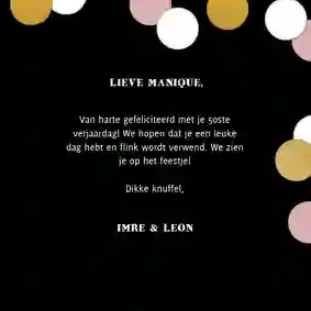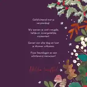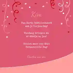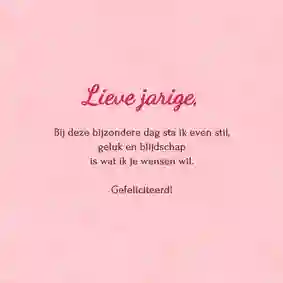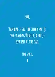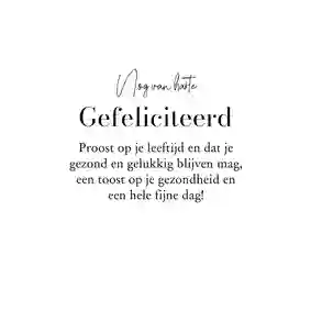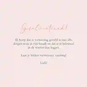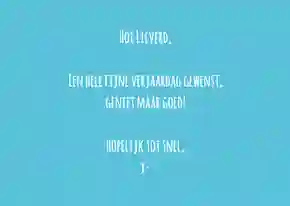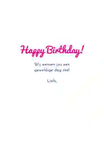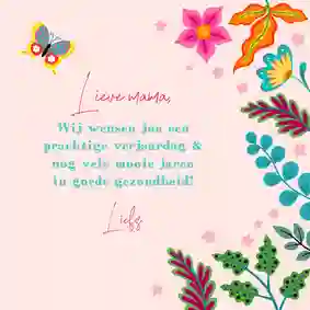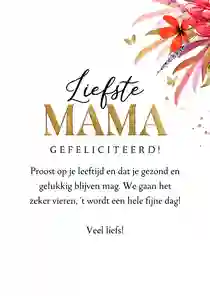 Op de verjaardagskaart voor je moeder kun je een tekst schrijven als ‘Allerliefste mama, gefeliciteerd!’ of ‘Voor mijn jarige mama, gefeliciteerd’. Is ze naast moeder ook oma? Dan is het extra leuk om je tekst te beginnen met ‘O, ma, je bent jarig!’.