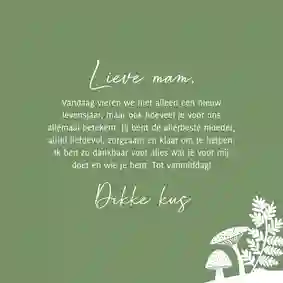 Jouw moeder is de beste. Daarom hebben onze designers hun best gedaan om de leukste en liefste kaarten voor jarige mama’s te ontwerpen. Speciaal voor moeders die gek zijn op bloemen, mama’s die wel een wijntje lusten en natuurlijk moeders met groene vingers. Waar je ook voor kiest, je kunt alle verjaardagskaarten extra persoonlijk maken door er een leuke foto van haarzelf of jullie samen aan toe te voegen. Dat wordt een tranentrekker!