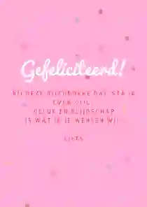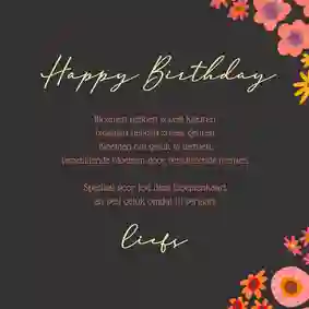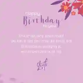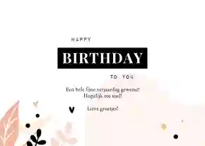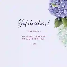 Op de verjaardagskaart voor je moeder kun je een tekst schrijven als ‘Allerliefste mama, gefeliciteerd!’ of ‘Voor mijn jarige mama, gefeliciteerd’. Is ze naast moeder ook oma? Dan is het extra leuk om je tekst te beginnen met ‘O, ma, je bent jarig!’.