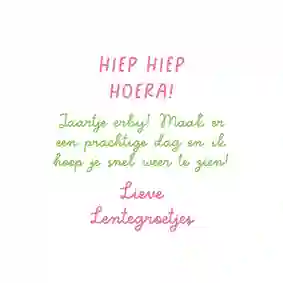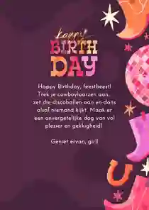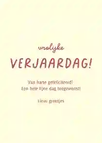 Kleine meisjes, die nog geduldig de nachtjes tot hun verjaardag aftellen, verras je met een verjaardagskaart voor kinderen. Maar ook voor tienermeisjes, volwassen vrouwen en oudere dames vind je het ultieme kaartje in het assortiment verjaardagskaarten voor vrouwen. Ook voor speciale verjaardagen kun je bij Kaartje2go terecht. Stuur bijvoorbeeld een verjaardagskaart voor een vrouw van 50 of 60 jaar. Maar ook verjaardagskaarten voor vrouwen van 21, 30 of 40 jaar vind je in de collectie. En heeft een dame de respectabele leeftijd van 80 of 90 jaar bereikt? Stuur dan een XL verjaardagskaart en maak er een groot feest van.