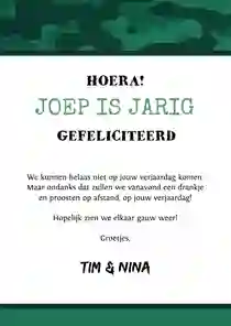 De leukste verjaardagskaarten voor een man vind je bij ons. Speciaal voor het feliciteren van je zoon hebben we diverse kaarten. Door het filtermenu te gebruiken, maak je eenvoudig een selectie van de kaarten. Ben je bijvoorbeeld op zoek naar een verjaardagskaart in een specifieke stijl, zoals stoer, humoristisch of klassiek? Dan selecteer je dit in het filtermenu. Dit geldt ook voor het thema. Je kunt kiezen voor onder andere feestelijke kaarten met confetti of typografische verjaardagskaarten. En houdt jouw zoon wel van een biertje? Dan zijn de verjaardagskaarten met bier misschien wel een leuke optie. Op deze manier wordt het kiezen van de perfecte kaart voor je zoon een makkie!