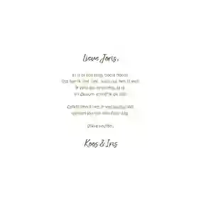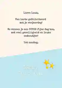 Geef de verjaardagskaart voor je zoon een extra persoonlijk tintje door de kaart te personaliseren. Dit kan al heel simpel door zijn nieuwe leeftijd op de kaart te zetten. Wil je een stapje verder, dan kun je een foto van je zoon toevoegen aan de kaart. Dit doe je eenvoudig met onze kaartmaker. In de kaartmaker vind je ook toffe illustraties, de mogelijkheid om andere afbeeldingen te uploaden en teksten op de kaart te zetten. Is je zoon nog jong? Dan is speelgoed een leuk idee. Een boek of chocolade doet het ook altijd goed. Het cadeau eenvoudig aan de bestelling van je kaart toe.