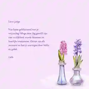 Bij Kaartje2go vind je verjaardagskaarten voor de leukste vrouwen in jouw leven. Ook voor een zus slaag je bij ons. Het selecteren van een kaart die past bij je zus is heel makkelijk dankzij ons filtermenu. Is ze bijvoorbeeld gek op kunst of muziek? Dan selecteer je dit onder ‘thema’. Of misschien ben je wel op zoek naar de meest vrolijke en feestelijke kaart. In dat geval kies je voor een thema zoals slingers & ballonnen of ‘confetti’. In het filtermenu kun je ook kiezen voor verschillende stijlen. Denk bijvoorbeeld aan klassiek of stijlvol. Of misschien past een stoere verjaardagskaart wel beter bij jouw zus. Natuurlijk kun je de verschillende filters ook met elkaar combineren. Vervolgens pas jij de kaart helemaal naar wens aan met de illustraties in de kaartmaker. Vergeet niet om er een mooie verjaardagswens op te zetten.