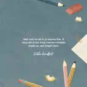 Een kind een fijne eerste schooldag toewensen, begint bij het vinden van een leuke kaart. Is deze missie al geslaagd, maar weet je niet wat je erin moet zetten? Geen zorgen; in onze kaarten staan verschillende voorbeeldteksten die je over mag nemen. In sommige teksten staan geruststellende woorden voor kinderen die het maken van nieuwe vriendjes of vriendinnetjes spannend vinden, in andere teksten vind je vrolijke succeswensen voor het nieuwe schooljaar. Is je kaart voor de eerste schooldag niet voor je eigen kind bedoeld, maar voor dat van een ander? Bij twijfel kun je ook aan de papa of mama vragen wat je in de kaart zou kunnen zetten.