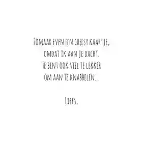 Cheesy woordspelingen, flauwe grappen en hilarische gedichtjes; kaarten met grappige teksten zijn ontzettend populair. En daarom hebben onze designers hun lolbroek aangetrokken. Het resultaat? Een hilarische collectie vol kaarten met grappige teksten en spreuken. Denk aan kaartjes met oneliners, woordgrappen en gedichtjes om van te grinniken. Zo stuur je eenvoudig en snel een grappige wenskaart naar je dierbaren.