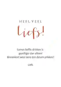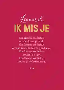 Je wederhelft is niet de enige persoon die je kunt missen. Het niet kunnen zien of spreken van een vriend, vriendin of familielid kan ook behoorlijk pijn doen. Het leed van elkaar moeten missen iets verzachten? Stuur deze persoon een mooie ‘Ik mis je’ kaart. De kaartjes op deze pagina zijn eenvoudig aan te passen, en dat geldt ook voor onze andere liefde kaarten. Tussen deze kaarten kom je ook ontwerpen met een foto of fotocollage tegen. Vooral als je elkaar nog een tijdje moet missen, is het fijn als deze persoon kan kijken naar een lieve foto van jou of jullie samen.