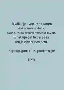 Op zoek naar een inspirerende kaart voor een vriend, collega of familielid? Bij Kaartje2go vind je de mooiste wenskaarten met bijzondere spreuken, krachtige quotes en originele teksten. Kies je favoriete ontwerp met een inspirerende boodschap uit en pas ‘m naar wens aan in de kaartmaker.