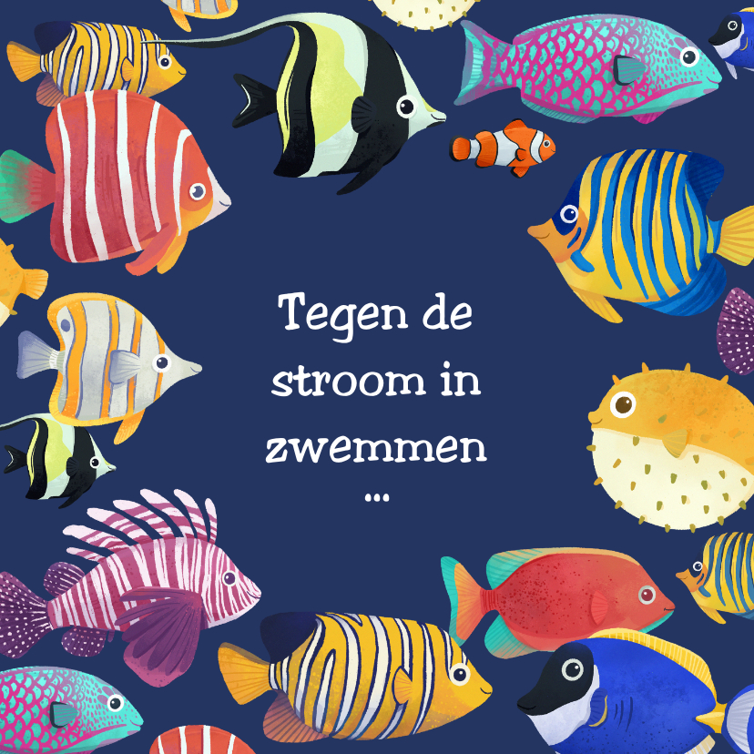 Een kleurrijke wenskaart met school tropische vissen. Met motiverende spreuk.