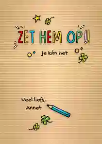 Je kiest een kaart uit onze collectie motiverende kaarten, of je maakt je eigen kaart helemaal zelf. Je kan zelf teksten, foto's, figuren en kaders toevoegen zodat het echt jouw eigen kaart wordt. Bestel je voor 21:00 uur, dan doen wij je kaart diezelfde dag nog op de bus.