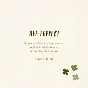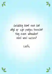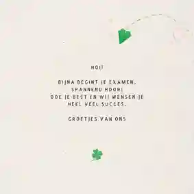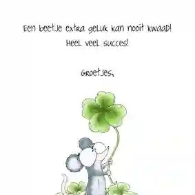 Examens: de ene persoon haalt er zijn schouders bij op, de ander kan er nachten wakker van liggen. Ken jij iemand die tot de laatste groep behoort? Laat deze topper weten dat je in hem of haar gelooft met een motiverende succes kaart! Kies een ontwerp uit met boeken, papier en potloden of een groen klavertje vier. Het liever luchtig houden? Op de succes kaarten met dieren staan grappige woordspelingen, die de ontvanger ongetwijfeld aan het lachen maakt. Deze examen wenskaarten kunnen trouwens ook gebruikt worden voor schooltoetsen, theorie-examens en toelatingstoetsen!
