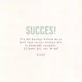 Het examen is een belangrijke mijlpaal in iemands leven. Je wilt jouw vriend, vriendin of familielid daarom veel succes toewensen. Doe dit door zelf een succes kaartje te maken of door een bestaande kaart te bewerken. Het uploaden van een eigen foto geeft het kaartje een persoonlijke touch. Kies bijvoorbeeld een foto van jullie samen, zo zal hij of zij jouw steun extra voelen. Zo geef je hem of haar extra kracht en zelfvertrouwen voor de belangrijke dag(en). Wij doen de rest!