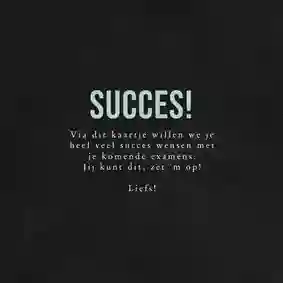 Weet je niet met welke tekst je je vriend of vriendin succes gaat wensen? Onze copywriters hebben een aantal succesvolle teksten voor je verzameld. Lees de motiverende teksten eens rustig door, wie weet zit er iets leuks tussen en hoef je maar een paar woordjes aan te passen. Bekijk hier de geslaagd teksten. Je kopieert ze zo op de kaart!