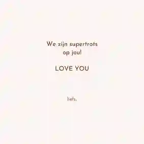 Trots! Op het doorzettingsvermogen van je vriendin, de knappe sportprestatie van je neefje of gewoon, omdat je moeder een echte powervrouw is. Wat de reden ook is, een kaart met ‘trots op jou’ zorgt ongetwijfeld voor een klein geluksmomentje bij de ontvanger. En dat geeft jou ook meteen een goed gevoel! Kies dus het leukste kaartje met ‘trots op jou’ en maak ‘m af met een positieve boodschap. Welke topper maak jij blij met een lieve trots op jou kaart?