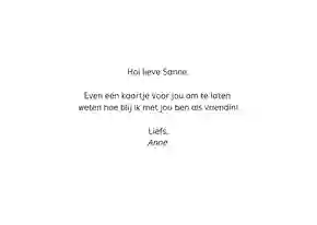 Heb je een leuke vriendschapskaart gevonden? Dan is het tijd om aan de slag te gaan met onze online kaartmaker. Hiermee maak je in een handomdraai een unieke kaart voor die ene vriend of vriendin. Voeg bijvoorbeeld een leuke foto van jullie samen toe. Pas de achtergrond, het lettertype en de kaartkleuren aan. Hoe persoonlijker je de vriendschapskaart maakt, hoe toffer de ontvanger ‘m waarschijnlijk vindt. Vergeet ook niet te vertellen wat je zo leuk aan diegene vindt, waarom je jullie vriendschap koestert of haal een gezamenlijke herinnering op. Dit kan bijvoorbeeld met een zelf opgenomen videoboodschap. Heb je wat extra inspiratie nodig? Bekijk dan deze teksten over vriendschap. Je goede (vriend)in zal je vriendschapskaart ongetwijfeld waarderen.
