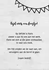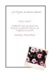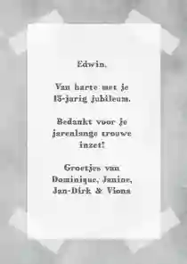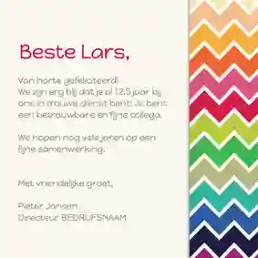 Bij Kaartje2go hebben we een grote collectie zakelijke kaarten. Wij staan als bedrijf graag stil bij de mijlpalen van onze collega’s, en motiveren jou graag hetzelfde te doen. Daarom hebben we een groot aanbod aan jubileumkaarten om een werkjubileum te vieren. Ook een medewerker in het zonnetje zetten en laten weten dat je zijn of haar toewijding waardeert? Organiseer een jubileumfeest, etentje of borrel en nodig collega’s uit.