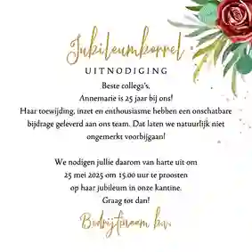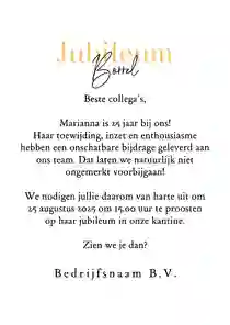 Een jubileumkaart verdient een luxe verpakking. Laat de uitnodigingen daarom eerst thuis - of op kantoor - bezorgen en stop de werkjubileum kaart in een zilveren, gouden of parelmoeren envelop. Wil je voorkomen dat een van je collega’s de uitnodiging op zijn of haar bureau laat slingeren? Direct naar thuisadressen versturen kan ook!