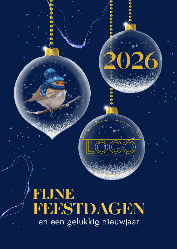 Stijlvolle kerstkaart met glitters, glazen kerstballen waarbij de inhoud naar eigen wensen aangepast kan worden. (geen goudfolie)