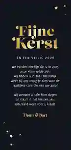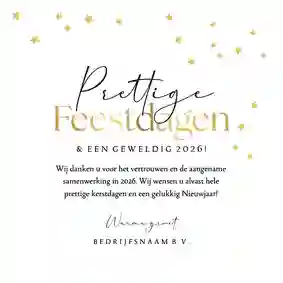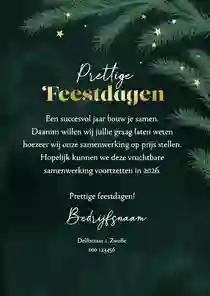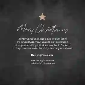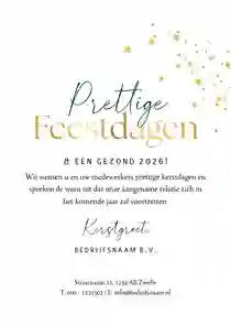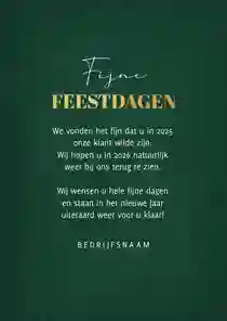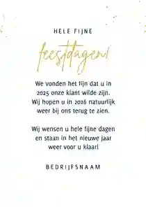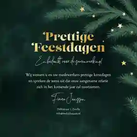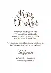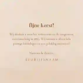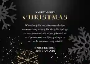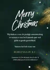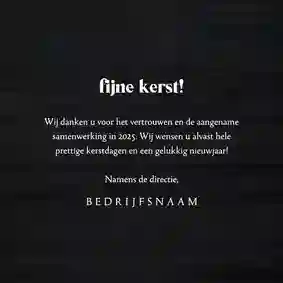 Een kerstkaart met logo is de ideale manier om je bedrijfsnaam nog eens onder de aandacht te brengen bij relaties. Daarnaast is het een mooie manier om medewerkers te bedanken voor hun inzet en samen vooruit te kijken naar het nieuwe jaar. In de kaartmaker kun je onze zakelijke kerstkaart met logo nog verder personaliseren. Pas de kleuren bijvoorbeeld aan naar jullie huisstijlkleuren, of voeg de bedrijfsslogan toe voor nog meer herkenbaarheid. Voor een extra luxe gevoel tippen we graag onze foliedruk kerstkaarten met logo.