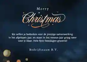 Een kerstkaart is niet compleet zonder een passende kerst- of nieuwjaarswens. Denk aan een dankwoord, een vooruitblik of een warme felicitatie voor het nieuwe jaar. De meeste kaarten bevatten al een voorbeeldtekst die je makkelijk kunt aanpassen. Op zoek naar nog meer ideeën? Neem dan een kijkje op onze inspiratie-omgeving voor zakelijke kerstkaarten.